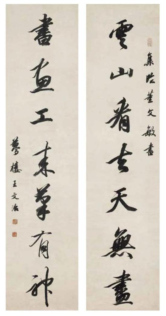王文治 行书七言联 《云山看去天无尽 书画工来笔有神》