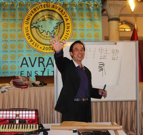 庞中华推广硬笔书法。受访者供图他也注重在海外推广硬笔书法。2012年,庞中华应邀走进联合国总部,开设为期3个月的汉字书法班,近距离地用横、竖、撇、捺,让联合国官员及工作人员了解中国文化,又唱又写的“快乐教学法”效果依然很好。
