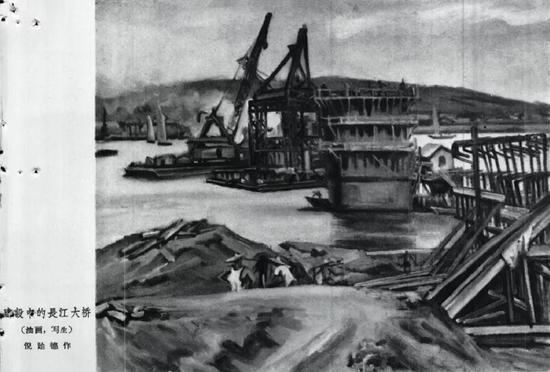 倪贻德对作品要求严格,据汪诚一回忆:“倪老画画一丝不苟……画得不行,涂掉,再画,再涂掉,再画,他就一定要画好为止。”此幅写生即是如此,作品曾刊载于1956年12月《美术》杂志,后倪贻德进行了关键性改动,经裁剪、修改呈现为目前之面貌。倪贻德将原先近景的堤岸和劳动工人裁去,左下角改涂棕黄色,扩大江水面积,使梁架、桥墩成为绝对的中心,构图紧凑、重点突出,主题更加明确,是画家“为人民而艺术”理念引领下的重要成果。