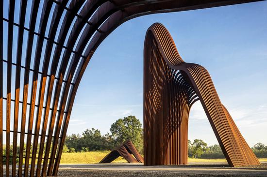The sculpture is about 20 meters high and the longest span is 35 meters。 Inspired by traditional landscape painting from Song and Yuan Dynasty, the artist used digital design to generate the hierarchy of the layers, and then chooses weathered steel plates as the material to create the unique artistic conception of traditional Chinese landscape painting。 When people walks in or around the sculpture, the shadow and lights dance around the organic outlines of the sculpture, forms a “feasible, promising, accessible and livable” experience。 The sculpture created a common ground for space and time; in here people are free to explore their traditional spiritual ideology, as the spirit and surrounding landscape merge together。