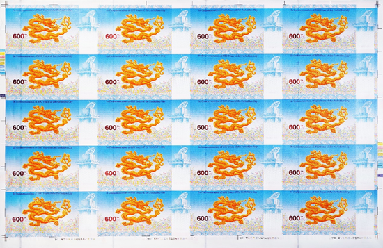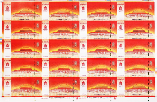 “财运亨通”版故宫纪念券由二十枚未经裁切的故宫纪念券构成,其表现形式类似于整版未经裁切的人民币连体钞。在其正面的下沿部位,刊有“中国印钞造币”的中英文logo、故宫博物馆的中英文字样及logo,以及印制过程中的各种专属文字、标识、色标、印制日期等,极具趣味性、鉴赏性和收藏投资价值。