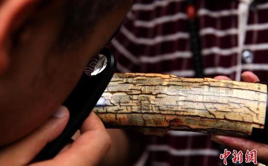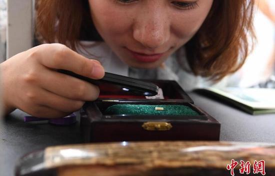 6月23日,“2018重庆与世界嘉年华”活动上,重庆璧山区潘启慧老人展出自己不少微刻作品,其中最小的微刻作品字号细如毛发,只能借助放大镜观看。图为老人的微刻作品吸引民众用放大镜观看。