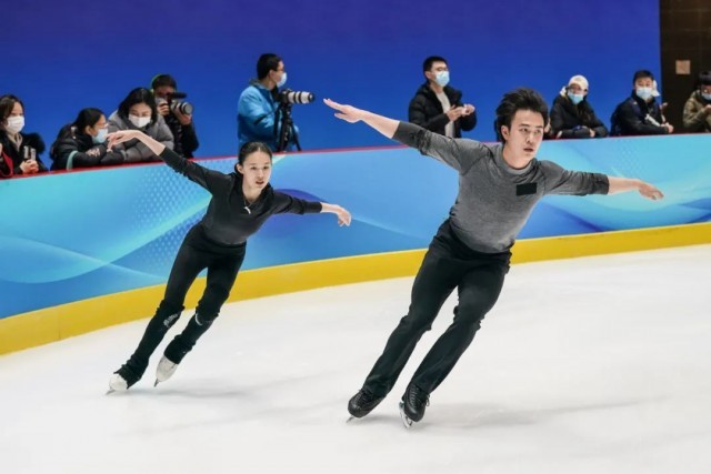 2022年1月5日,中国花样滑冰国家集训队在北京进行北京冬奥会前最后一次公开训练,三对双人滑组合在首钢园冰上训练中心进行了上冰训练。新华社记者 彭子洋 摄