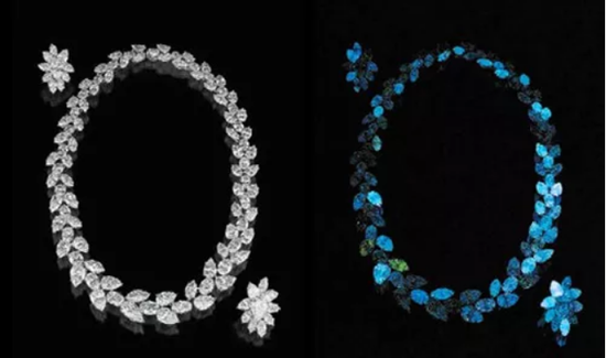 钻石的荧光顾名思义,就是指钻石在紫外光的激发下发出的光。有一部分钻石会发荧光,一般是蓝白色的荧光,也有少部分的钻石发黄色的荧光。这个指标是有别于钻石4C参数的另一个指标,可以作为评估钻石品质的辅助性指标。