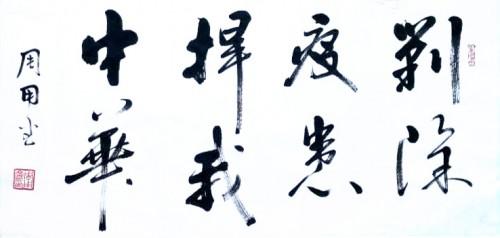 周用金,字怀佑,号湖湘墨客、湖南省安乡县人。中国书法家协会理事,中国艺术研究院特聘研究员、中华文化促进会常务理事,中南大学、湖南师范大学书法专业兼职教授。出版有《周用金行草字汇》、《中国古今书法家》、《周用金千字帖》、《中国书法经典遗存》、《常用字行草帖》、《大学生行草字典》、《历代书论精要》等专著。曾应约为韶山毛氏宗祠、朱镕基故居等书写楹联,辽宁号航空母舰曾专门约请登舰书写系列作品。