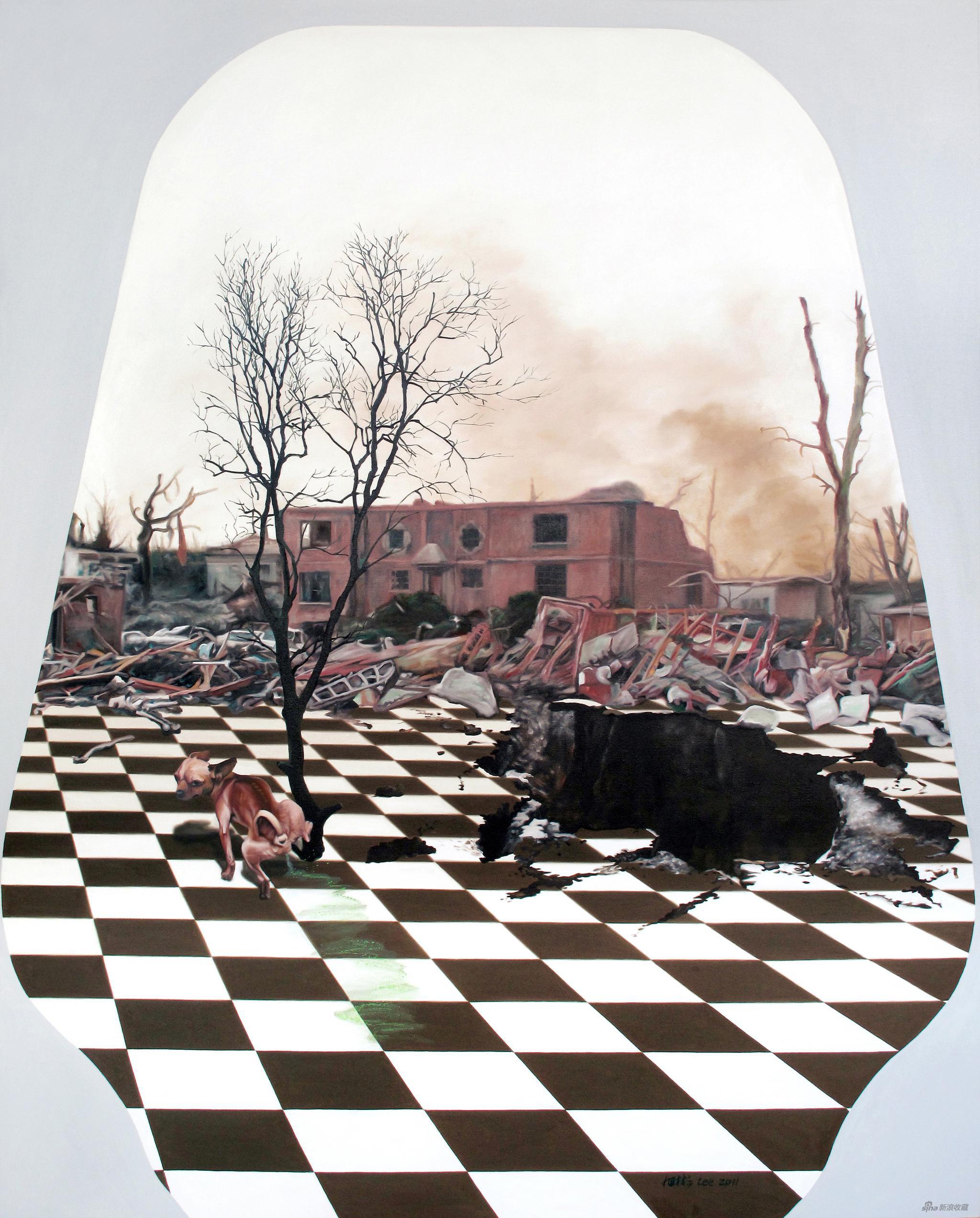 2009年的《大风景》、《何去何从》系列,是艺术家经由强烈的外部刺激后自然的描述。众所周知,2008年发生了汶川大地震和金融危机,灾难过后的残垣断壁、废墟场景,促使李旭彬重新思考“自我”与“他者”之间的关系。《大风景》、《何去何从》描绘了艺术家眼见为实后对于人与都市、人与自然、人与灾难的思考。他戏剧性的将都市地标建筑物等元素与灾难性场景结合,背景处理的波谲云诡,呈现出波澜壮阔的带有某种预言性质的末日景观,何去何从的追问,带有了行而上学的哲学意义。李旭彬由对“我”的生命体验的思考,上升到对于人类文明共同体未来性的担忧与虚构的预设,进入一种更广阔的叙事语境,他不再纠结于情绪的外露与久居都市的无所适从,尽管这种状态一直存在,而是重新审视“生命体验”与“生命存在”之间的关系。
